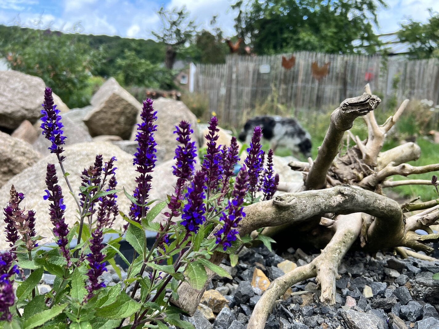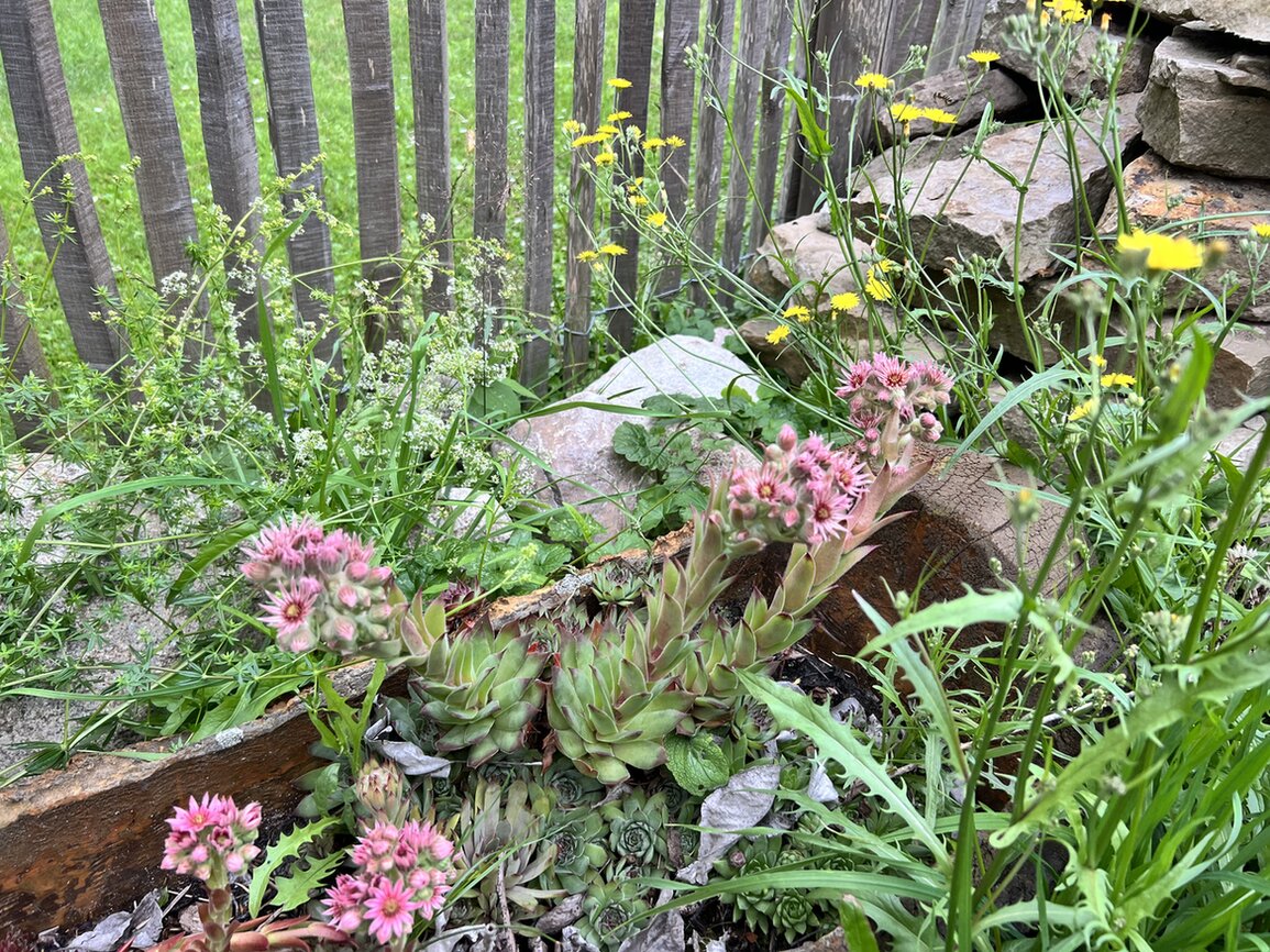 In der Hotspotzone sind einige Steinhaufen und Trockenmauern entstanden. Eine stützt eine Art Hügelbeet, auf dem Johannisbeeren wachsen, die andere rundet eine Eidechsenburg ab, die bis tief in die Erde ausgehoben wurde und als frostfreies Winterquartier dienen soll. Die Steinhaufen sind mit Sedum und Sempervivum begrünt worden, die Jahr für Jahr wunderschön blühen und kräftig wachsen.