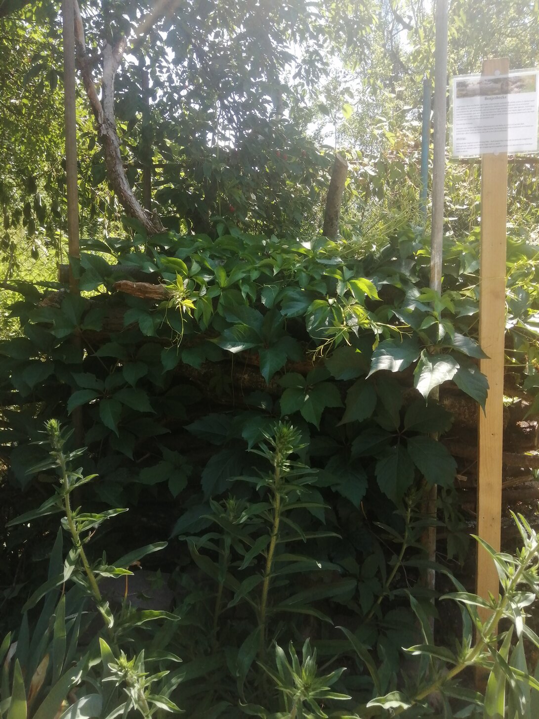 An Totholzelementen haben wir bisher eine kleine Benjeshecke welche bereits vom wilden Wein eingenommen wurde, einen großen Totholzhaufen, einen Reisighaufen und weiteres Totholz als Abgrenzung oder einfach als schönes Element im Garten. Als Steinelement sowie als Sandarium ist ein Sandhochbeet mit Trockenmauer diese Jahr dazu gekommen.