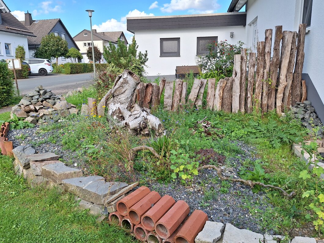 Die drei Zonen finden sich bereits im Vorgarten. Der ist umgeben von einer Pufferzone aus unterschiedlichen Sträuchern, z.B. Eberesche, Hundsrose, Faulbaum, Jelängerjelieber, einer Hainbuchen- und einer Totholzhecke. Die Hotspotzone besteht aus einem Schotterbeet mit kleiner Steinpyramide, stehendem und liegendem Totholz, einem weiteren Magerbeet und einer kleinen Sumpfzone. Als Ertragszone wurde ein Gemüsebeet angelegt, dass in diesem Jahr mit Kartoffeln, Kohl, Feldsalat und Spinat bepflanzt war.