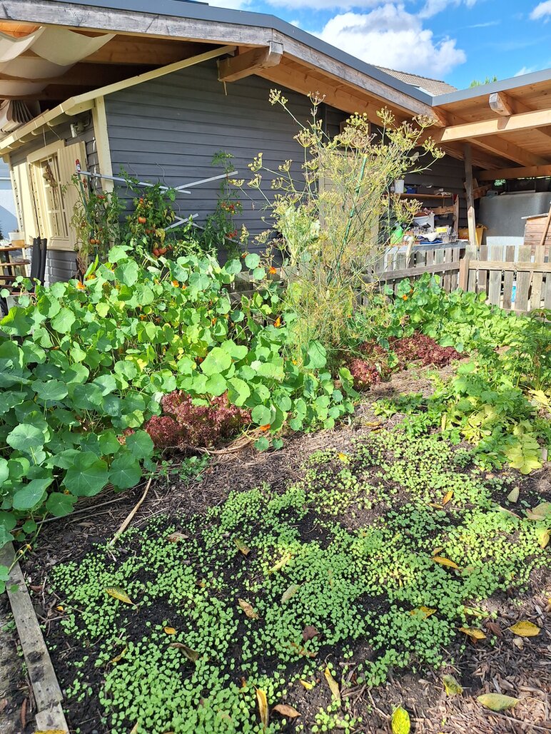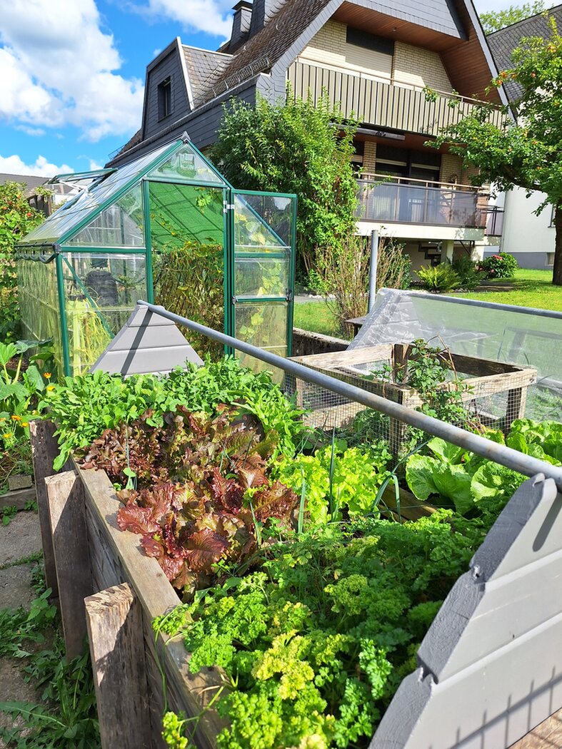 Der Gemüsegarten als Teil der Ertragszone versorgt uns seit zwei Jahren fast komplett mit Gemüse rund ums Jahr und beherbergt sechs Gemüsebeete, zwei Keyhole-Beete aus Paletten, ein Gewächshaus und ein Hühnergehege mit vier Hühnern. Außerdem gibt es noch zwei Apfelbäume, einen Birnenbaum, Brombeeren, Erdbeeren, viele Tomatenpflanzen und Kräuterbeete.