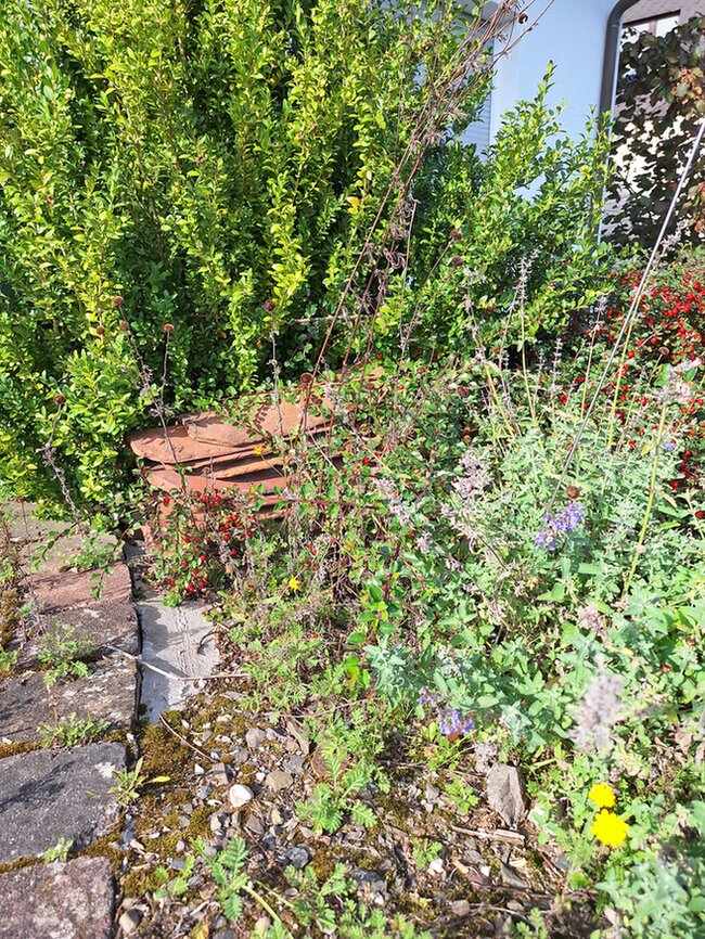 Die Sonnenfalle aus alten Dachpfannen begrenzt eines der Magerbeete, dahinter ein Buchsbaum.