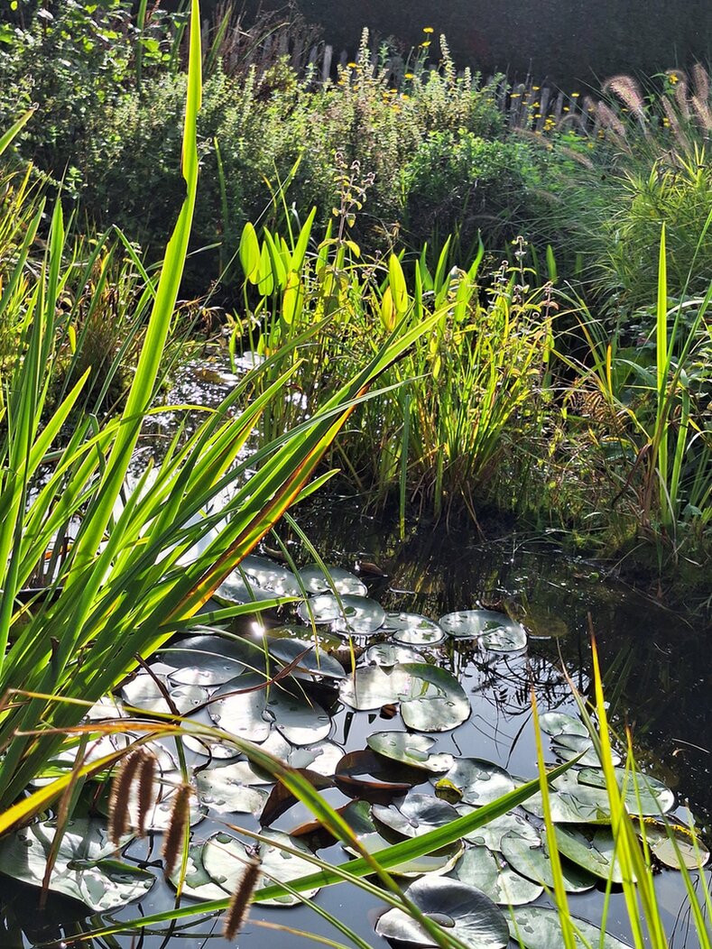 Der Gartenteich wimmelt vor Leben.