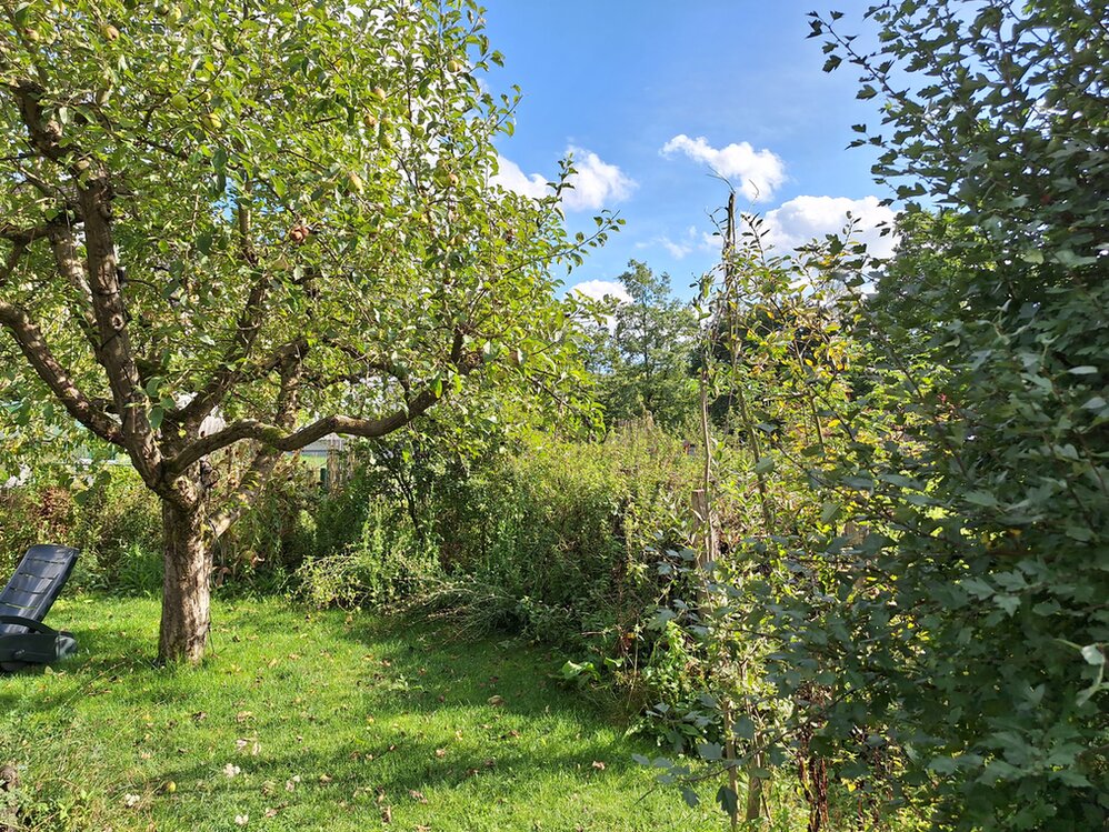 Begrüntes Saunadach, Gartenteich, Apfelbaum, im Hintergrund eine der Pufferzonen mit Totholzhecke (die "tote" Lebensbaumhecke gehört dem Nachbarn ;-)
