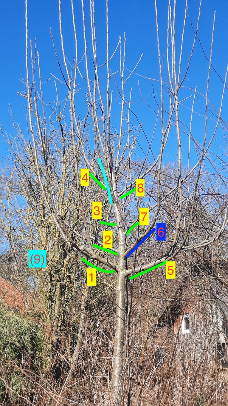 Evtl lässt ma die 6 auch als Leitast, weil eh schon dick, und nimmt 3 und 7 komplett weg. Andererseits sieht es aber so aus, als stünde die 6 in direkter Konkurrenz zur 5, deswegen würde ich sie schwächen wollen, bis sie weg kann. Es sei denn, die 6 trägt zu einer schöneren Verteilung der Leitäste bei als die 5, dann bleibt die 6 stehen und wird auch erst mal nicht an den roten Schnitten abgeleitet, dann muss ich schauen, daß die 5 abgeleitet wird, bzw. Waagerecht gestellt wird, so daß sie zu Fruchtholz umgewandelt wird.