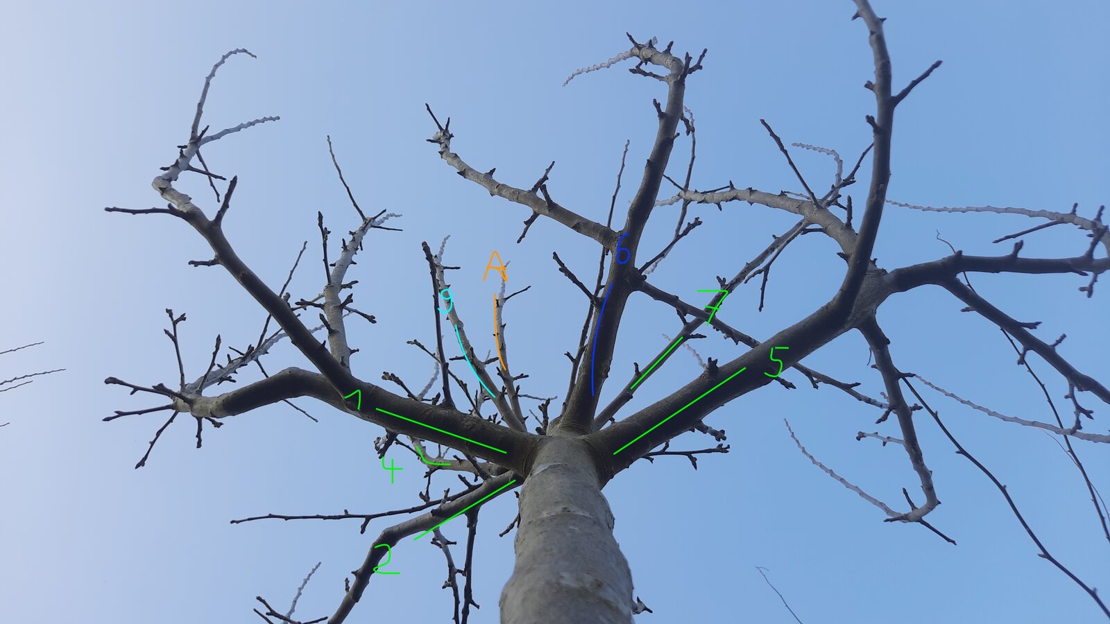 Ich habe die Äste nummeriert. Blickrichtung des Bildes ist Norden, also sehen wir die Südseite des Baumes.