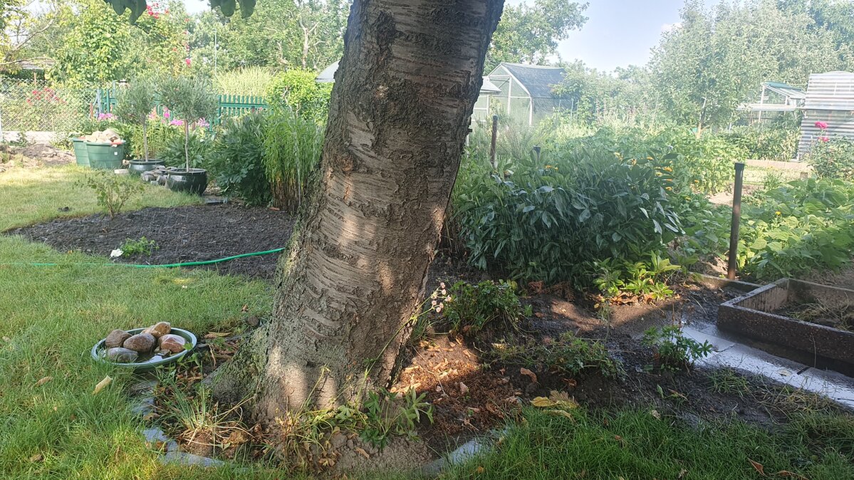 Das ist mein aktuelles Projekt. Ich habe hier ein Halbschattenbeet angelegt. Über 2 Jahrzehnte war hier "nur" englischer Rasen. Ich war verwundert, wie viele Grasoden das sind. Was mich sehr enrstaunt hat, war der Boden drunter. Ich wollte den mit der Gabel lockern, da ich lehmigen Boden habe. Pustekuchen. Ich kam gar nicht rein. Ich wollte eh mit Erde auffüllen und habe unten drunter etwas Kompost verteilt. Evtl. Probiere ich es später nochmal. Eingezogen sind beteits 2 Stachelbeeren, Bergflockenblume und Fingerhut. Am linken Rand des Gartens stehen unter anderem 6 Pfingstrosen. Von 4 werde ich mich im August/September verabschieden. Ebenso von den Neophyten dazwischen. Es kommt dort dieses Jahr noch ein Wald-Geißbart zu und eine rote Johannisbeere hin. Der Waldmeister fühlt sich ebenso wohl. Große Sterndolde und Blutstorchschnabel stehen hinten am Baum.