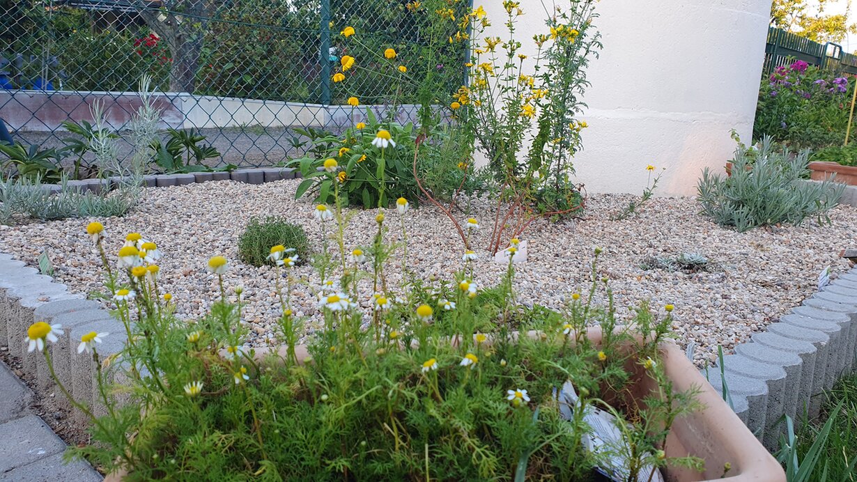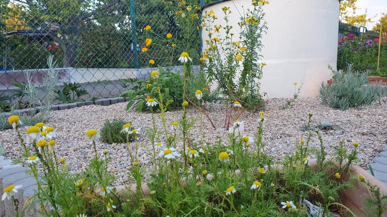 Im Kiesbeet steht aktuell Färberkamille, Johanniskraut, Thymian, Oregano, Salbei, Rosmarin, Currykraut und Lavendel. Ich bin noch nicht ganz zufrieden, mal schauen, was mir noch einfällt. Außen stehen gerade Töpfe mit Kamille, Pfefferminze und marokkanischer Minze.
