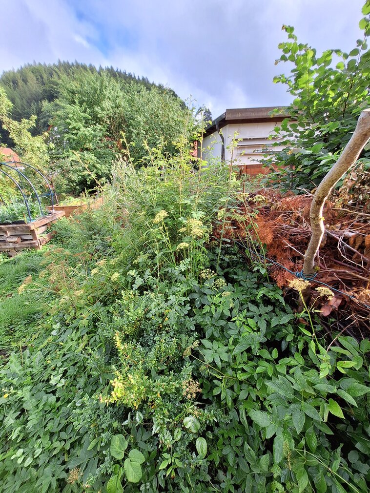 - Das ist mein Totholzwall. Er liegt überwiegend schattig und das untere Holz hat schon überall Moos angesetzt. Ich liebe Moos. Der ist eher zufällig entstanden, da wir bei Gartenübernahme uns erstmal etwas Platz schaffen mussten. Rechts davon unser Urwäldchen. So ähnlich sah der ganze Garten aus. Auf dem Wall landen auch ausgegrabene Stumpen. Oft lasse ich sie in der Erde, aber es gibt hartnäckige, die immer wieder austreiben, oder Stolperfallen sind. Wenn alles hoch wächst, sieht man die ja nicht mehr.