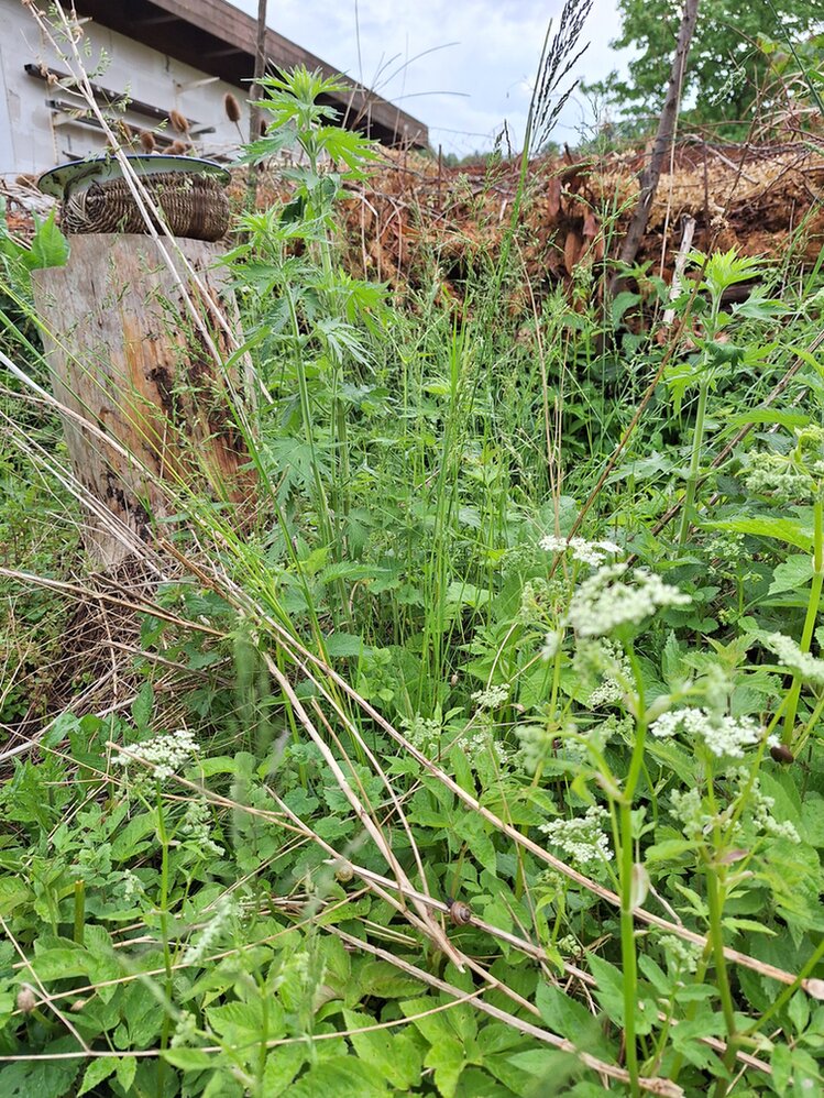 Wir haben das Haus mit dem Grundstück 2010 gekauft. Davor stand es mindestens 8 Jahre leer. Der Garten war zwar verwildert, aber es war keine Vielfalt vorhanden. Viele Nadelbäume, die wir entfernt haben, haben alles beschattet. Viel Giersch, der nichts anderes wachsen ließ, außer der silberblättrigen Goldnessel. Letztere ist invasiv und ich kämpfe nun schon Jahre dagegen an. Giersch drängen ich etwas zurück, aber er darf hier weiterhin am Rand wachsen und blühen.