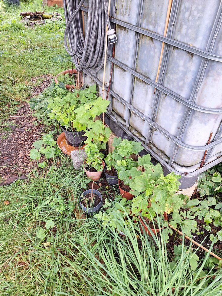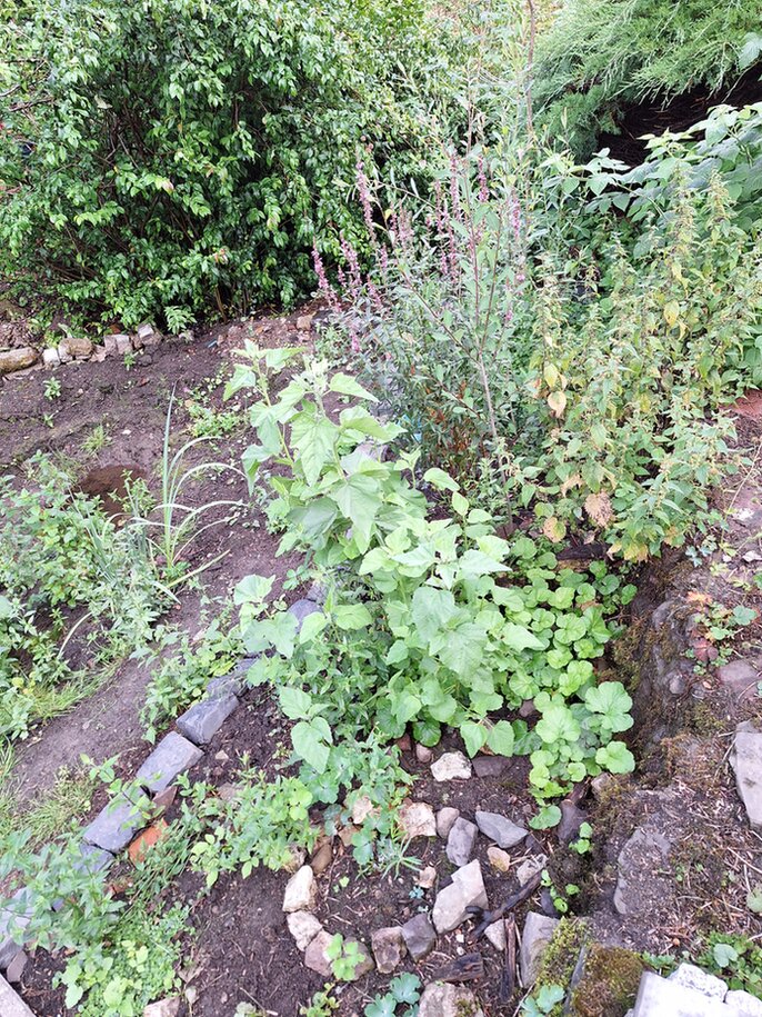 Brennesseln und Giersch wachsen hier begeistert von allein. Angesiedelt habe ich unter anderem: Herzgespann, Wasserdost, Echter Eibisch, Blutweiderich, Schwarze Königskerze, Heil-Ziest, Wilder Oregano, Strauchefeu. In Kübel, weil sie es lieber trocken möchten, wachsen Gewöhnlicher Natternkopf, echtes Leinkraut, rotes Seifenkraut und kleinblütige Bergminze.