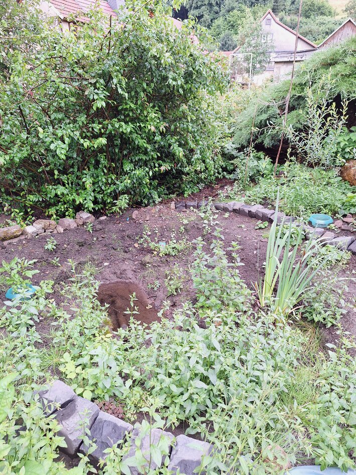 Hotspot-Zone: Wir haben eine Quelle und sie läuft permanent in einen geplanten Teich. Das Loch ist schon da. Eigentlich fehlt nur die Folie, aber das wird wohl noch dauern. Deswegen ist das mein Möchtegernteich. Viele Insekten und Vögel lieben aber das Loch und es kann auch sein, dass es so bleibt. Auch habe ich letztes Jahr einen Miniteich angelegt. Dieses Jahr war schon ein Bergmolch drin. Die Pflanzen tun sich noch schwer darin. Um den Teich habe ich, da es ja nun eine große Sumpfzone ist, viele Pflanzen eingesetzt: Blutweiderich, Wasserdost, Fieberklee, Sumpfiris und noch andere, wo ich gerde den Namen vergessen habe. In der Nähe habe ich Betonpflanzsteine, die noch rumlagen, zu einer Lehmsteilwand zurecht gemacht. Ansonsten biete ich Markhaltige Stängel an, die ich immer in die Totholzzäune stecke.
