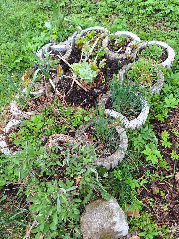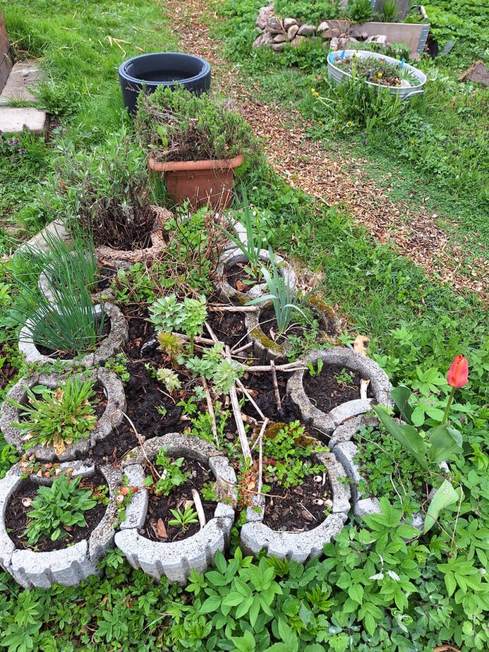 Die Pflanzringe waren hier schon vorhanden. Das Kräuterbeet habe ich auch damit gemacht. Liegen wie ein Dreieck. In der Mitte habe ich Liebstöckel und Zitronenmelisse gepflanzt. Direkt in die Ringe Salbei, Schnittlauch, noch mal Melisse, Wilder Oregano, Echter Eibisch, Heil-Ziest und zwei bleiben sich selbst überlassen. Da will nichts so richtig, weil zu schattig vom Rest.