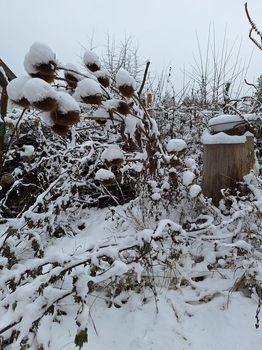 - Der längere Totholzzaun im Winter. Alles was davor oder dahinter wächst, bleibt einfach stehen. Der Baumstumpf bleibt auch so stehen. Ist leider Nadelholz, aber irgendeinem wird er schon mal nützen. Darauf steht immer eine Wasserschale als zusätzliche Insektentränke. Wird nicht viel genutzt, weil woanders besseres Quellwasser in meinen Möchtegernteich sprudelt.