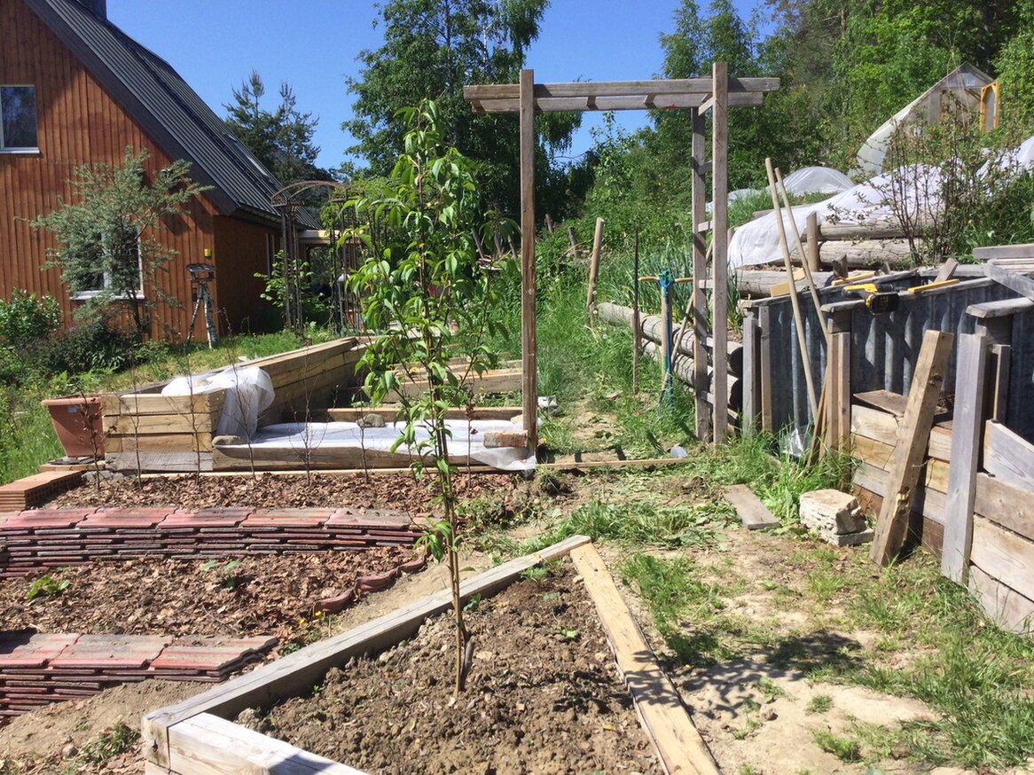 Aber jetzt ist alles Gemüse in den Boden. Auch habe ich weiter an der Gestaltung vom Gartenteil gearbeidet der hinter diesem langen Blumenkasten liegt. Hier wurden mit Hilfe von alten Dachziegeln zwei kleine Terrassen geschaffen und eine Hainbuchenhecke gepflanzt. Auch ein Pfirsichbäumchen fant hier seinen Platz. Im Abrisshaus lag noch eine alte Holzleiter. Die wurde gekappt und daraus entsteht jetzt einen Rosenportal. Dieser Durchgang soll einen Übergang markieren zwischen der Ertragszone und die Arbeidsecke. Hier steht das Gartenhäuschen mit dem Gartenwerkzeug, unzählige leere Blumentöpfe und die Kompostbehälter. Ist aber auch ein Sitzplatz wo es windgeschützt ist und gutes verweilen in der Abendsonne.
