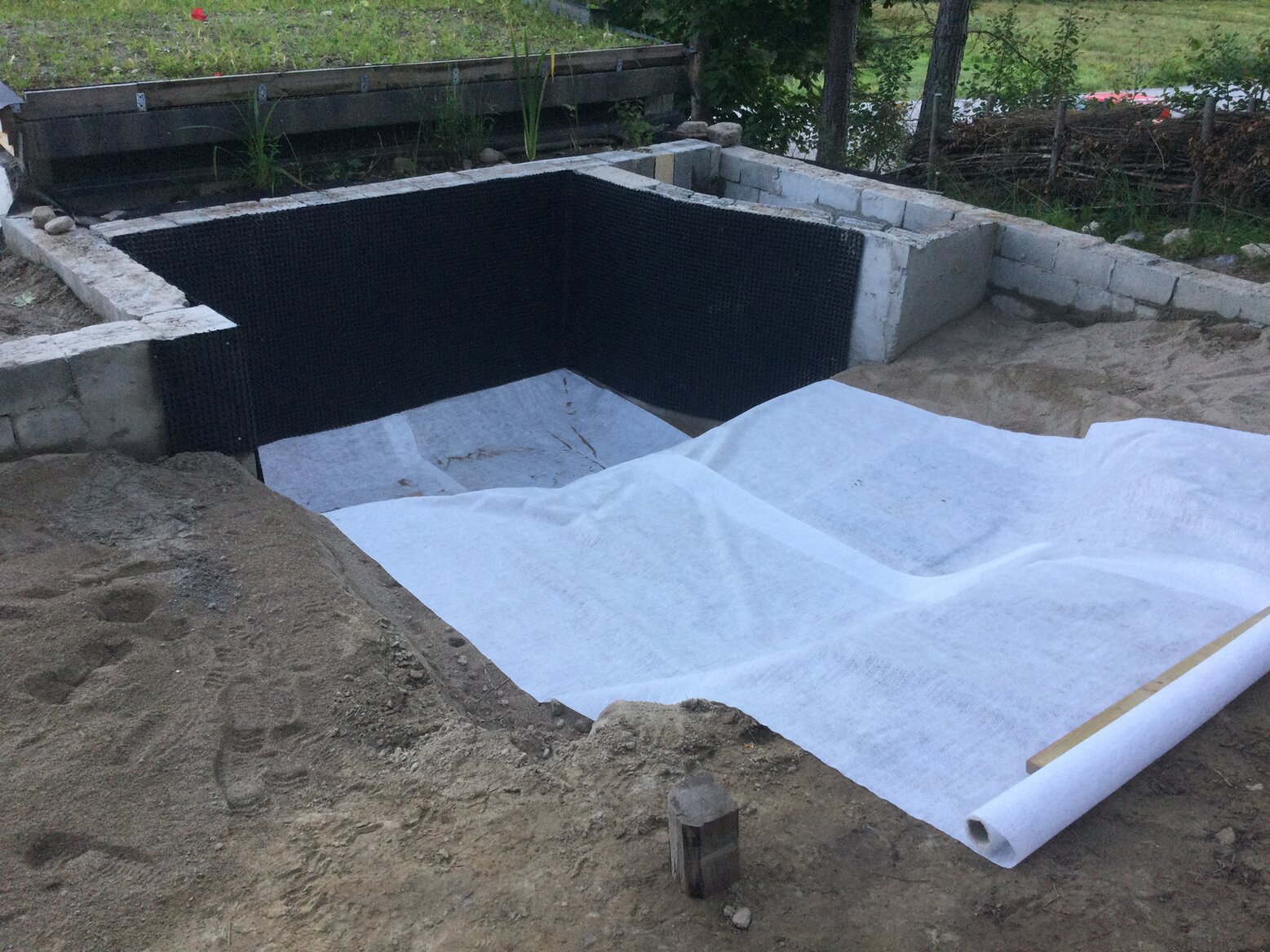 Die Mauer verkleidet mit einer Noppenfolie, den Sand im tiefsten Teil verstrichen und angefangen mit der Schutzfolie. Ausserdem kleine Schäden in den Stufen mit Lehm verputzt. Da war der Tag um...