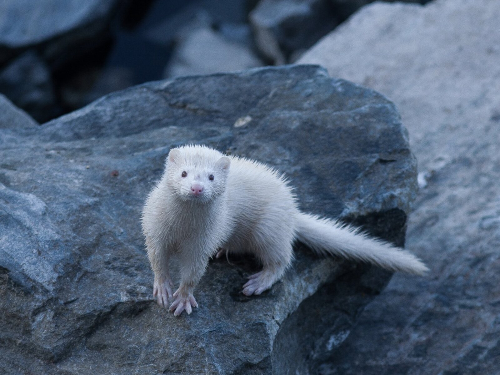 Vor ein paar Jahren gelang es mir diesen weissen Mink an mich heran zu locken und zu fotografieren. Das kam sogar in die regionale Nachrichten. Ein weisser Mink hat keine grosse Überlebenschancen. Die weisse Farbe haben nur die, wo beide Eltern weiss sind. (Normalerweise sind die braun-schwarz). Das war eigentlich ein Beweiss dafür, dass der in der aktuellen Saison entflohen war aus einer Zuchtstation. Die es aber offisiell in der Gegend nicht gab. Also möglicherweise eine illegale Zucht.