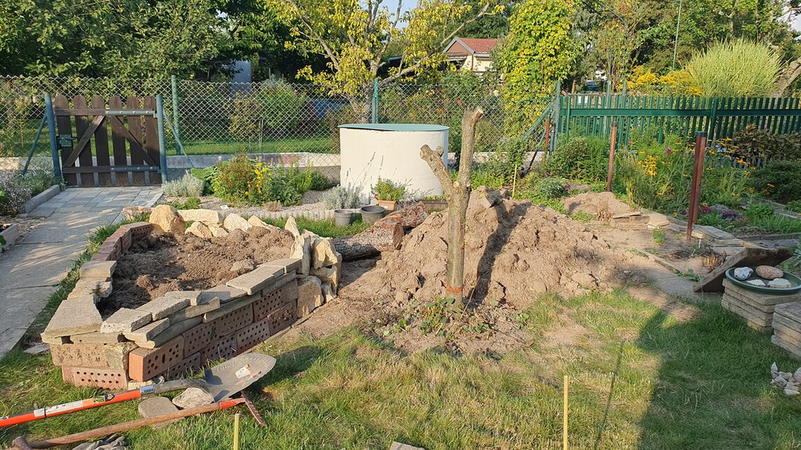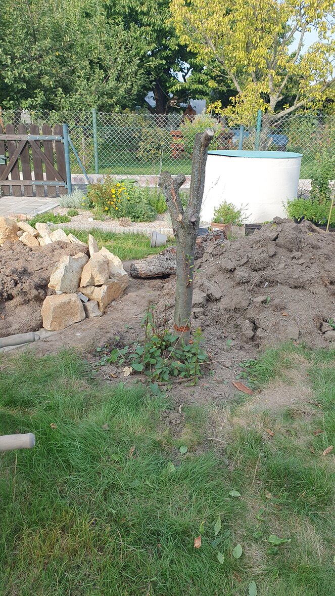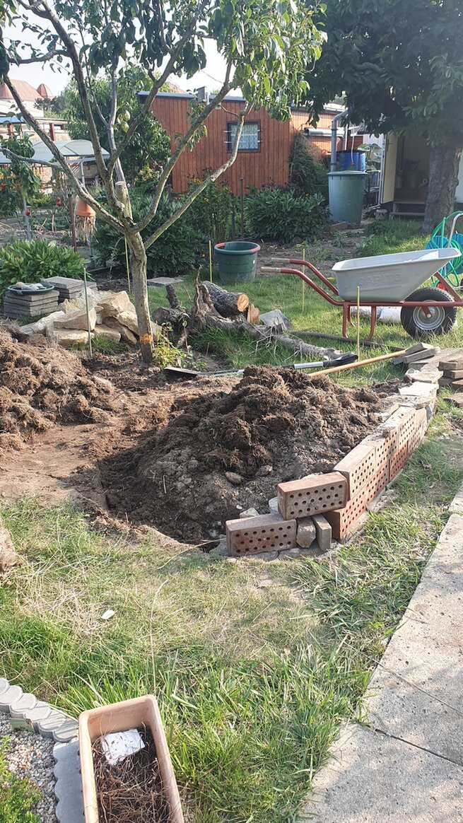 Ich habe einige Rasenkantensteine im Garten gefunden sowie einige Steine. Über eBay Kleinanzeigen habe ich mir aus der Umgebung noch Sandstein geholt. Beet 1 habe ich fertig. Mal schauen, ob die Mauern auch halten. Ich hab ohne Anleitung ganz frei Schnauze gebaut. Erst habe ich grob gelegt. Die Rasenkantensteine wurden meine Auflage. Dafür habe ich etwas Erde aufgehoben, damit sie ebenerdig werden. Mit etwas Kies und Sand drunter habe ich versucht, diese gerade auszulegen. Linksseitig habe ich mit dem Sandstein gearbeitet, rechtsseitig und hinten mit den Gartensteinen. Dahinter habe ich immer noch ein paar Steine zur Stabilisation gelegt. Weiter befüllen werde ich erst, wenn Beet 2 fertig ist. Hierfür steht jedoch noch der Stumpf von der Pflaume im Weg. Material muss ich auch noch besorgen. Keine 20 Kilometer von mir aus, wird Sandstein abgebaut. Ich bin versucht, mir von dort Bruchabschnitte zu holen. Man kann diese käuflich erwerben. Ich glaube, ich muss selbst erstmal schauen, wie groß die im Einzelnen sind. Und ob 35 Euro für einen Kubikmeter viel oder wenig ist. Alternativ schaue ich mich auf eBay Kleinanzeigen weiter um.