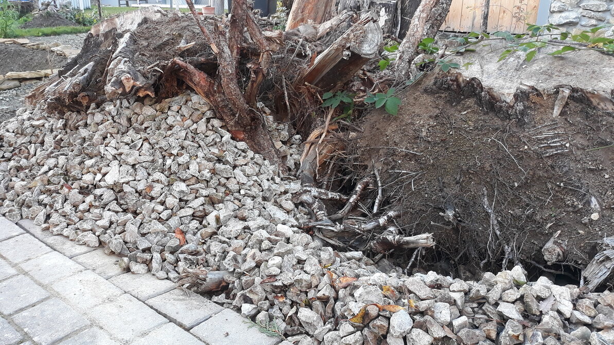 Ich ließ mir vom Abrissunternehmen kostenlos große Wurzeln in den Hof kippen. Ein Landwirt stapelte sie mir dann - ebenso kostenlos - hübsch auf.
