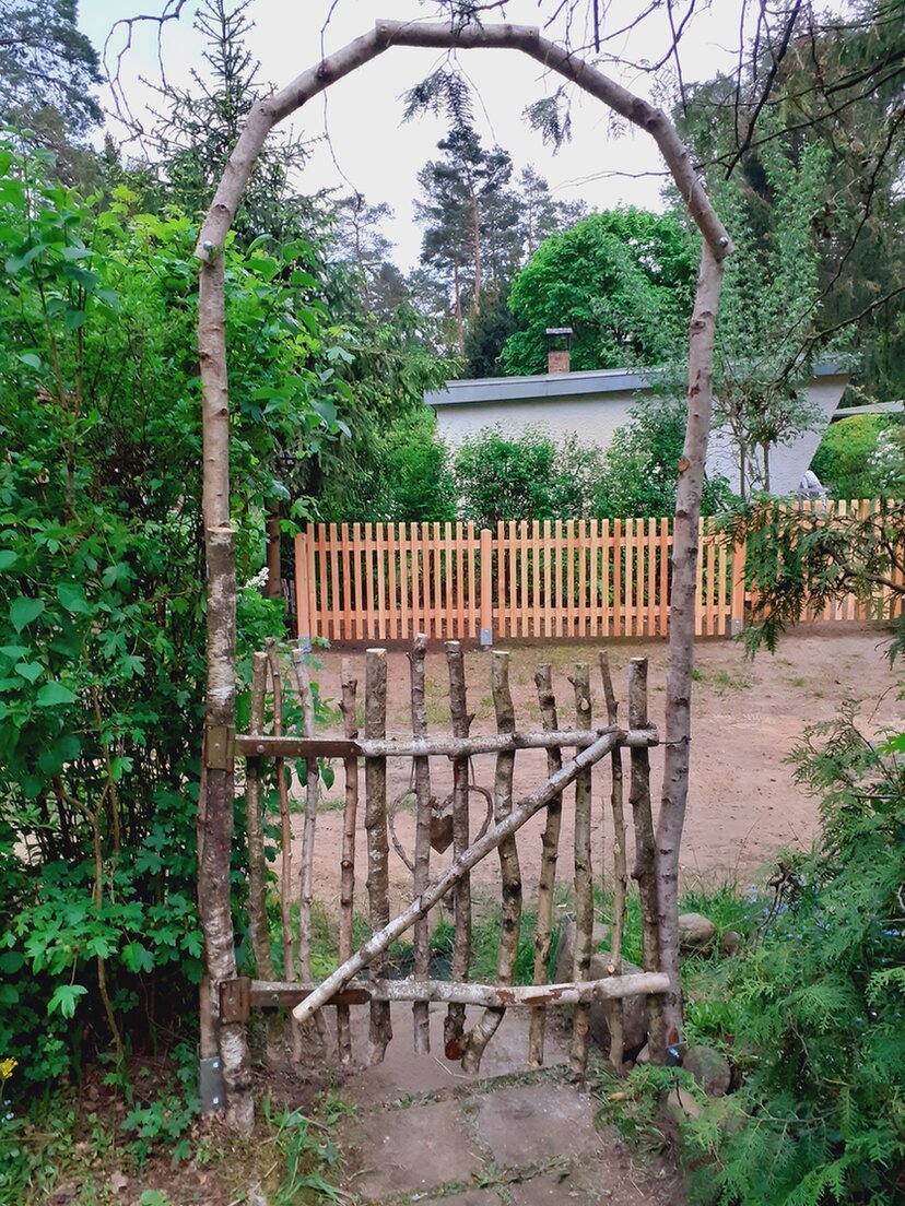 Tor und Torbogen aus Totholz (Birke) - die Thuja in der rechten Ecke ist jetzt weg...