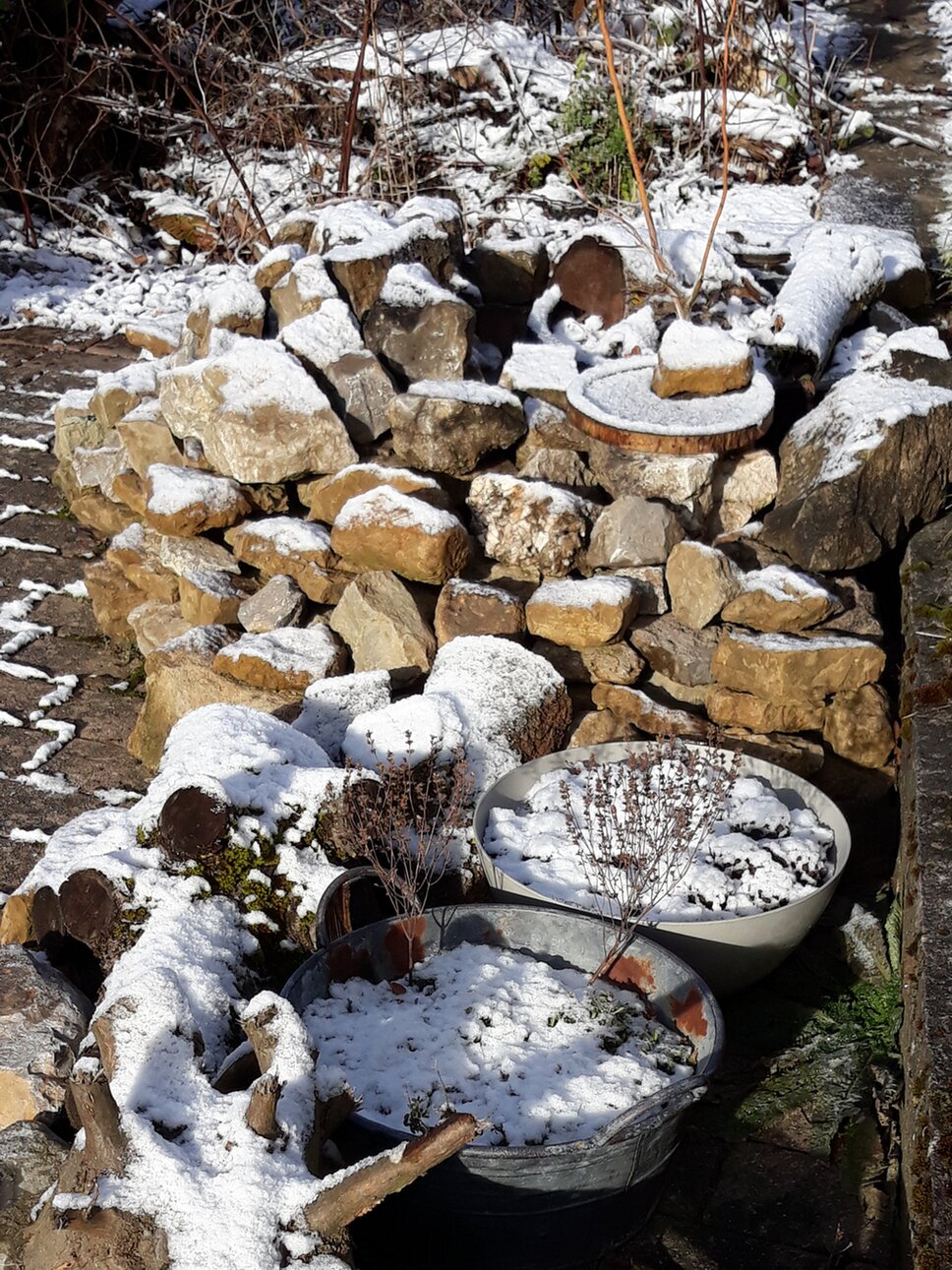 ... liegt für mich günstig erreichbar am gepflasterten Wäschetrockenplatz und zählt zur Pufferzone. Damit ist er ebenso wie die Stumpery und der Topfgarten im Hof immer ein lohnendes Winterprojekt, bei welchem man "fast gar nicht" bei der Winterruhe stört... hoffentlich! Die Spatzen flattern auf die umliegenden Dächer sobald ich ein neues Reisigbündel bringe und wenn ich mich auch nur kurz entferne, überprüfen sie sofort begeistert die Erweiterungen ihres Domizils. Da die Nachbarin seit vielen Jahren ganzjährig füttert, sind die Piepmätze Menschen gegenüber relativ mutig und gelassen. Im Moment fällt viel Baumschnitt aus der Nachbarschaft an und "Spatzenhausen" ist jetzt höher als ich.