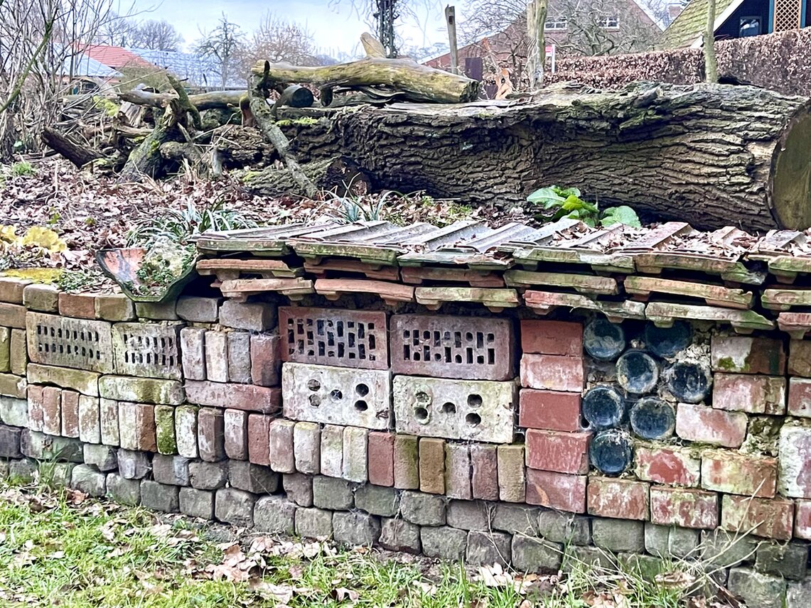 In 2020 ist an der langen Grundstücksgrenze entlang eine große Pufferzone entstanden mit lauter einheimischen Sträuchern und Naturmodulen wie Benjeshecke und Lebensraumhaufen.