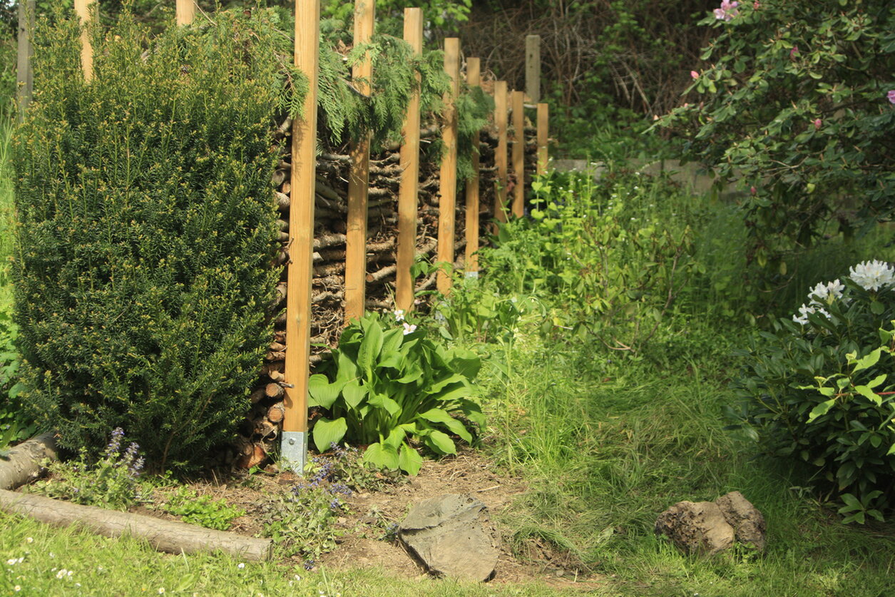 Eine Freundin pflegte den Garten ihres 80jährigen Schwiegervaters und brachte mir ein paar Himbeeren mit. Da ich trotz Wuchsmisserfolgs meiner Himbeeren am Südzaun immer noch ein paar Exemplare aus dem Tiny-forest ausgrabe, sperrte ich die Neuen präventiv ein. Und da ich den aufgeschütteten Weg im Wäldchen abstützen wollte (Wenn ordentlich alles kurzgeschnitten werden soll, rutscht der Mäher ins Beet.), kam ich auf die Lösung: