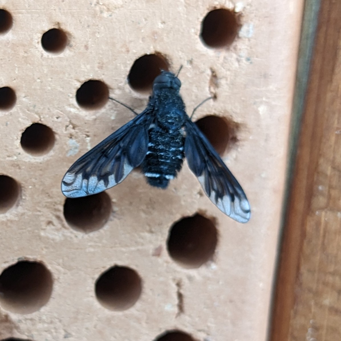 Heute hat diese Fliege meinen Bienenstein inspiziert. Google Lens meint es sei Anthrax Antrax (gewöhnlicher Trauerschweber) und ein Bienenparasit https://www.wildbienen.de/wbi-p871.htm