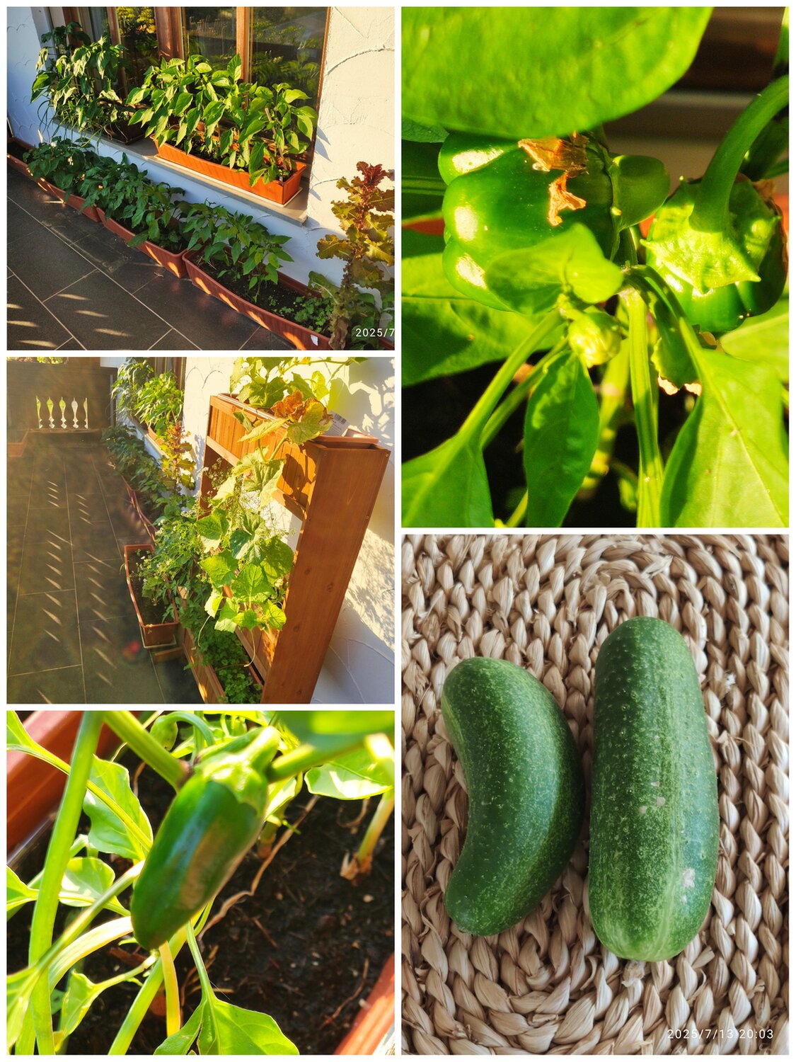 Auf dem Balkon stehen Paprikas, Chilis, Gurken, Salat der jetzt schießt und zu blühen beginnt ( Saatgut- Ernte!) , Koriander auch in Blüte, zwei Tomaten und Petersilie. Die ersten Gurken konnte ich schon ernten. Die Paprikas blühen und zeigen schon erste Fruchtansätze.