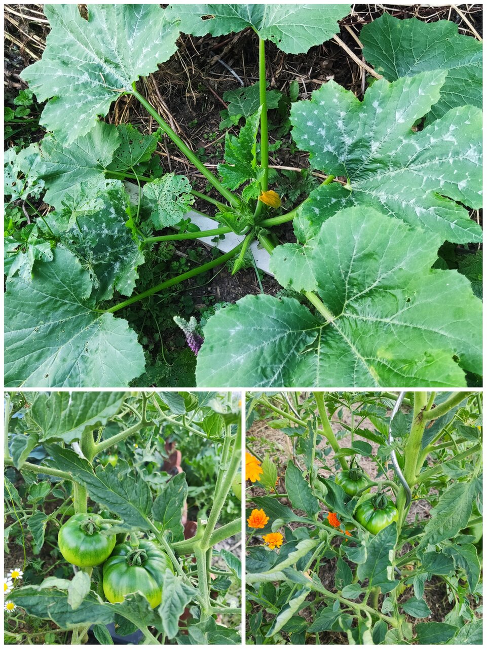 Zucchinis kämpfen bei mir dieses Jahr auch arg. Da mir die Schnecken die Ausgesäten weggefressen hatten, habe ich nochmal drei gekauft, aber die tun sich echt schwer. Eine andere gekaufte, steht derzeit etwas schattiger, die sieht deutlich kräftiger aus, bildet aber auch nur männliche Blüten. Die abgefressenen Tomaten haben sich zum Glück erholt und tragen zum Teil schon Tomaten.