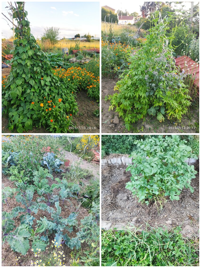 In der Ertragszone klettern die Stangenbohnen, die sehen gut aus. Ebenso die Inkagurken. Brokkoli kämpft. Die anderen Kohlsorten sind entweder von Schnecken befallen oder von Kohlweißling-Raupen. Alle sehen ziemlich abgefressen aus, aber treiben weiterhin aus ...alles Kämpfer !!
