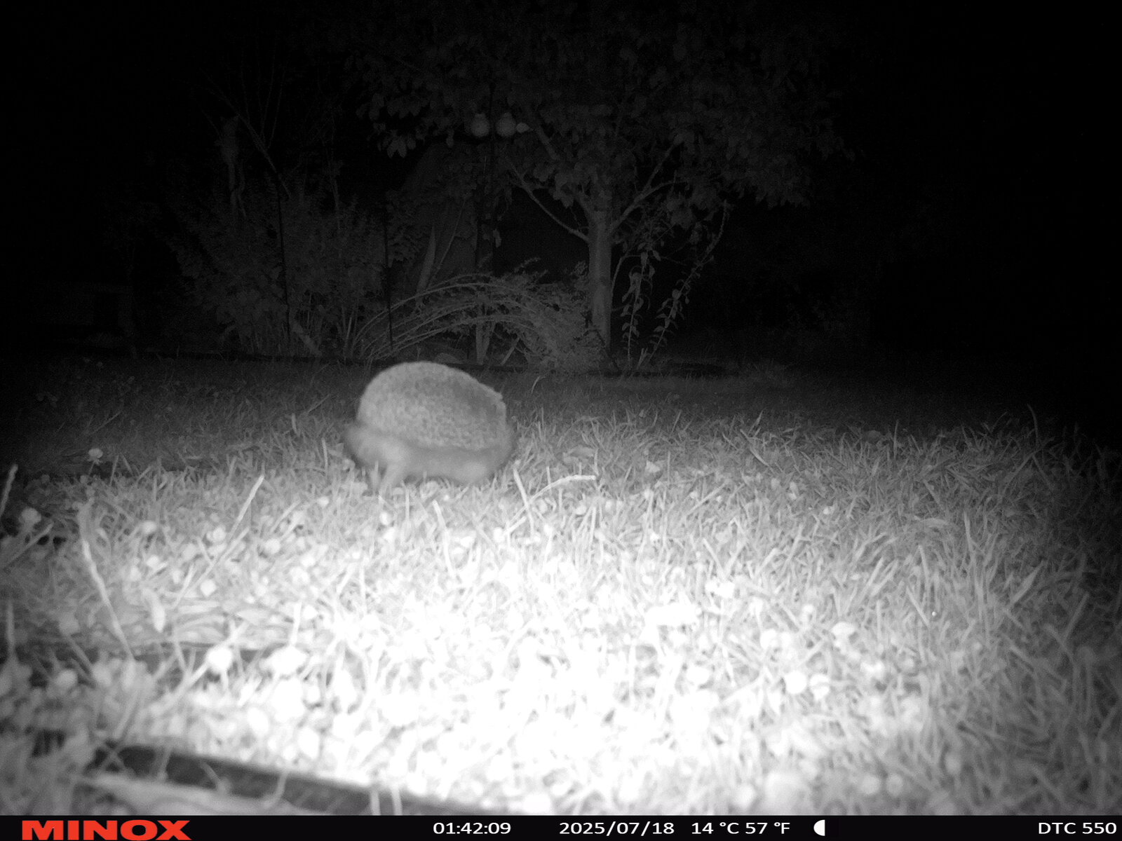 Warum kein Holzstoß und keine Totholzhaufen als Überwinderung? Die Antwort heißt Waschbär. Vor 15 Jahren ging es los, erst dachte ich an Teenagerstreiche, wenn die Holzhaufen auseinandergeräumt waren. Dann kam ich einmal früh in den Garten und hörte eine Blaumeise schreien, ich kann das nicht beschreiben. Das waren Schmerzen. Jemand hatte den Kobel geöffnet: also Riegel gedreht und geschoben. Der Meisenpartner und die Brut war weg. Inzwischen weiß ich, das war ein Waschbär. 2024 hat er mir drei Kobel auseinandergennommen. Einer ist mti Kabelbindern gesichert, zwei sind Kugeln, das dürfte er nicht knacken. Die Wildbildkamera hat einiges aufgezeichnet. In Veitshöchheim bei einem Vortrag über einheimische Wildtiere äußerten sie den Verdacht, dass ein Waschbär es schafft, einen eingerollten Igel zu töten, denn es wurden Haut mit Stacheln gefunden, war früher nicht war. Beweis ist - soweit ich weiß - noch nicht erbracht, also Foto. Ich möchte da nicht den ersten haben.