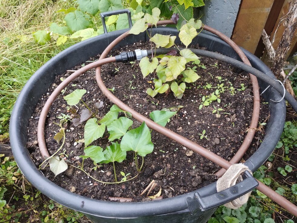 Der Platzbedarf ist ziemlich hoch da die Süßkartoffel sehr lange Triebe bildet (bis zu 3m!).