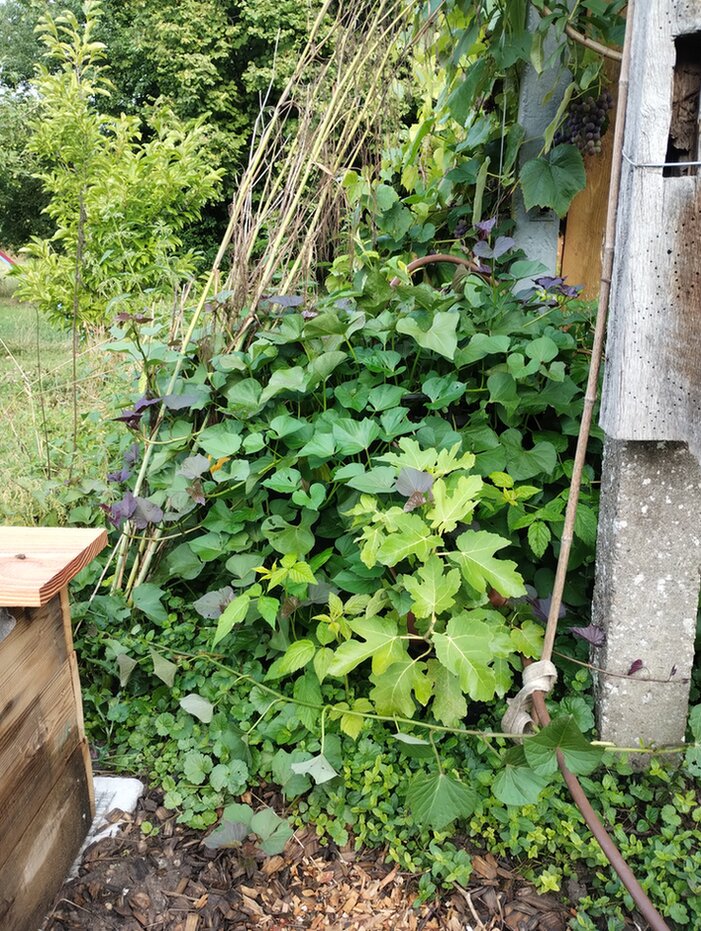 Da es Süßkartoffeln nicht kalt mögen habe ich sie jetzt erst ausgepflanzt wenn die Nachttemperaturen über 10 Grad liegen. Sie haben ein eigenes kleines Tiny-Hochbeet bekommen. Ok, ist optisch nicht das Highlight aber ich hoffe sie wird kräftig wachsen - und dafür hätte ich sonst keinen Platz gehabt.