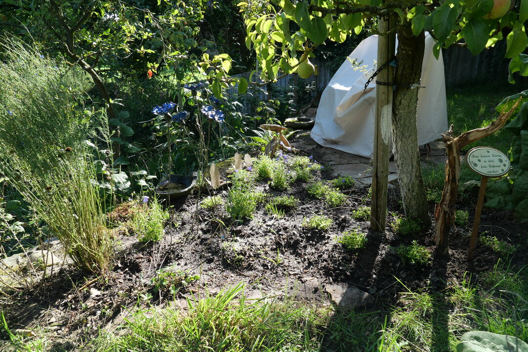 Gestern kam der Quendel und ergibt nun mit 1 Lein und 5 Campanula rotundifolia ein blaues Beet rund um die Birne mit angrenzendem Sitzplatz. Dazwischen habe ich noch Samen der wilden Möhre geworfen, mal sehen. Im Moment sind die Pflanzen noch heile, auch die in der anderen Baumscheibe.