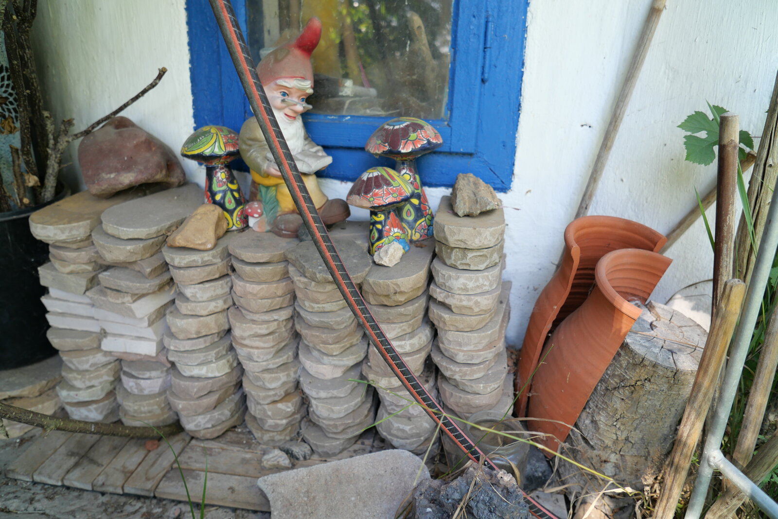 Schneckenhäuser: ich finde sie im Schatten, da bleiben sie nur liegen und zersetzen sich. An der alten Stelle spielten die Mäuse damit. Nun eben mal hier.