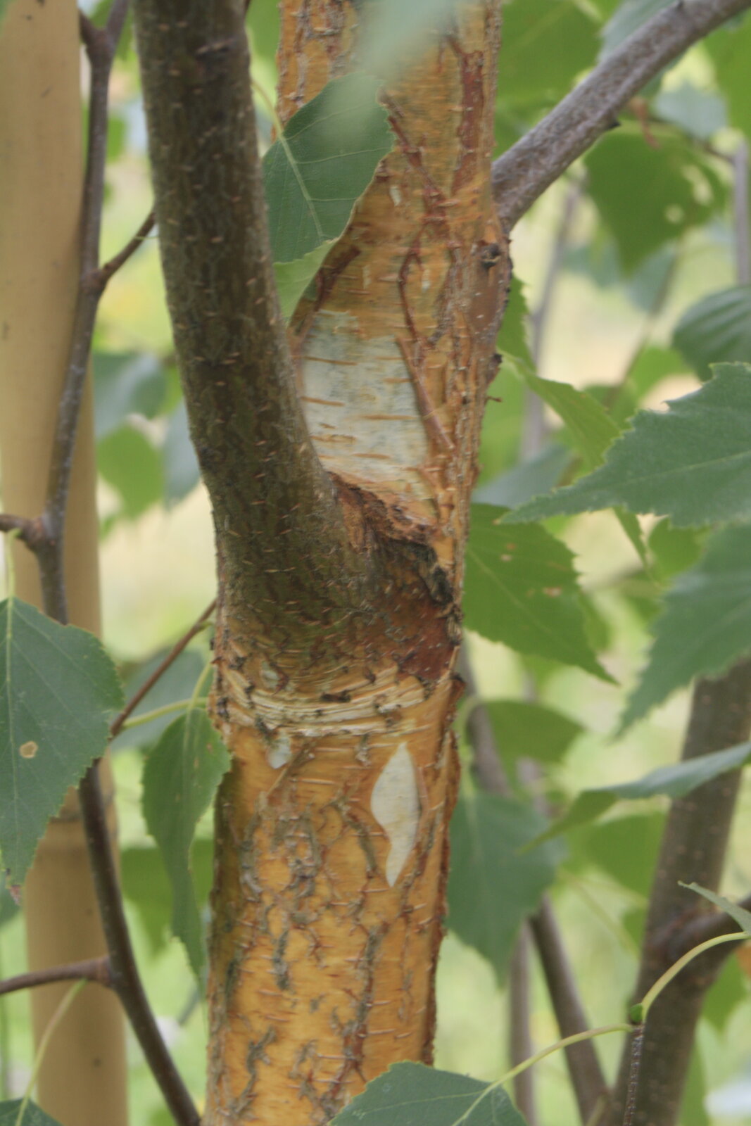 Die Häutung fiel mir letztes Mal an einer der Birken auf. Sie wächst anders als die anderen drei: buschiger, schneller, viel mehr Laub.