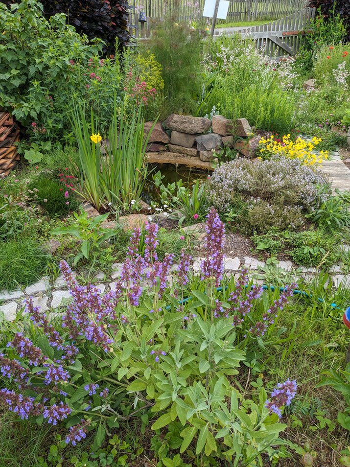 Die Hotspotzone zieht sich durch den ganzen Garten. Mein Rasenmäher ist mittlerweile eingemottet, alle Rasenflächen sind umgegraben, mit Sand abgemagert, viele Blumenzwiebeln eingebracht und mit Blühmischungen gesät. Sogar ein Teil des Straßenrandes blüht schon. Ich habe unendlich Steine angeschleppt und 2 halbhohe Trockenmauern sowie einen schönen naturnahen Weg gebaut. An jeder freien Ecke wachsen insektenfreundliche Stauden die ich fast alle selbst ausgesät habe. Wiesensalbei und Hornklee sind meine Lieblinge. Mittlerweile gibt es 2 gut besuchte Steilwände, überall Totholz und Steine, ein Sandarium und ein Sumpfbeet und eine Wasserlandschaft mit 2 kleinen Teichen und mehreren Bachläufen.