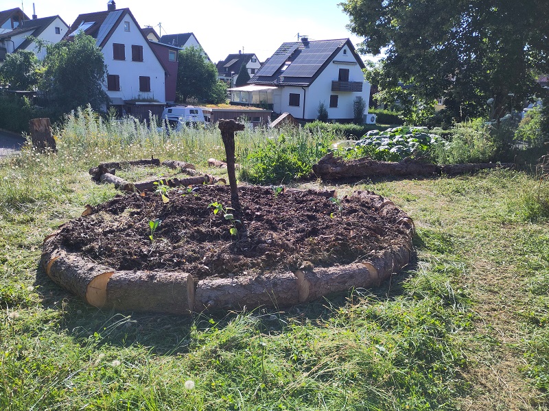 Durch Pflege- und Sicherungsmaßnahmen im Kindergarten hatten wir unverhofft Zugriff auf 4 Fichtenstämme. Die Lagerung der Stämme am Hortus führte allerdings zur Fehlinterpretation von Nutzern des Gemeindezentrums, dass diese und unser mit Mulchwürsten abgedecktes Ertragsfeld ein Abenteurspielplatz sei. Da wurde uns klar, dass wir den Hortus deutlicher von dem Teil der ebenen Wiese abtrennen müssen, der für sonstige Gemeindezwecke zur Verfügung steht. Aus diesem Grund wurden die ursprünglich anvisierten Projekte Sandarium und Käferkeller aufgeschoben. Nach einigem Überlegen entschieden wir uns dazu den Hortus durch eine 3-teilige Benjes-Hecke von der Wiese abzutrennen. Aus den Fichtenstämmen wollten wir Sitzgelegenheiten vor den Benjes-Hecken schaffen. Letztendlich wurde es eine zweigeteilte Benjeshecke, den wir hatten noch nicht genügend Füllmaterial zusammen. Da wir aber noch genügend Stämme übrig hatten ersetzten wir den dritten Benjeshecken-Riegel durch ein Vulkanbeet.