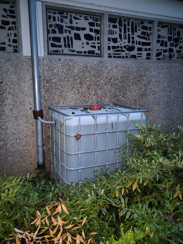 Eines von 6 Fallrohren des Kirchendachs angezapft und einen IBC-Tank installiert: