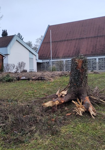 Wurzelstock einer Blaufichte von Pfarrkirche transferiert und in Gelände integriert: