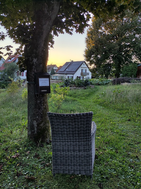 Im Nachgang dessen haben wir nun einen Briefkasten mit der Enzyklika an einem Baum im Hortus befestigt. Bei der Lektüre kann man nun ab und an den Blick über den Garten schweifen lassen