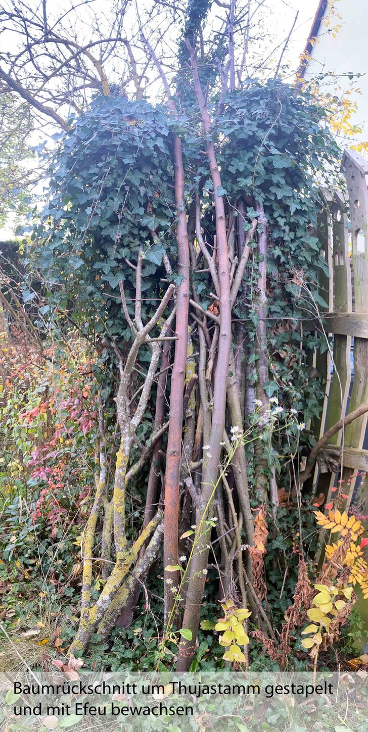 Die Pufferzone wurde vergrößert (damit die unsäglichen Thujahecken zumindest optisch verschwinden). Holunder, Liguster, Hundsrosen, Eiben, Berberitze etc., die sich von selber einfanden, durften – da wo es »passte« – an Ort und Stelle wachsen. Kirschlorbeer, Flieder, Forsythie mussten gehen, heimische Büsche wie z.B. ein Feuerdorn dafür zu uns kommen. Ein Steinhaufen, mehrere Insektennisthilfe hielten Einzug.