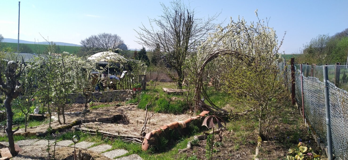 Bei Kleinanzeigen hatte ich in der Zwischenzeit ein altes Bett mit richtigem Gestell und federbestücktem Rost ergattert und kann seither auch in der Hütte übernachten. Dazu war es nötig das durchtropfende Regenwasser innerhalb der Hütte nach außen zu leiten. Es hat gut funktioniert - Fotos kommen später.