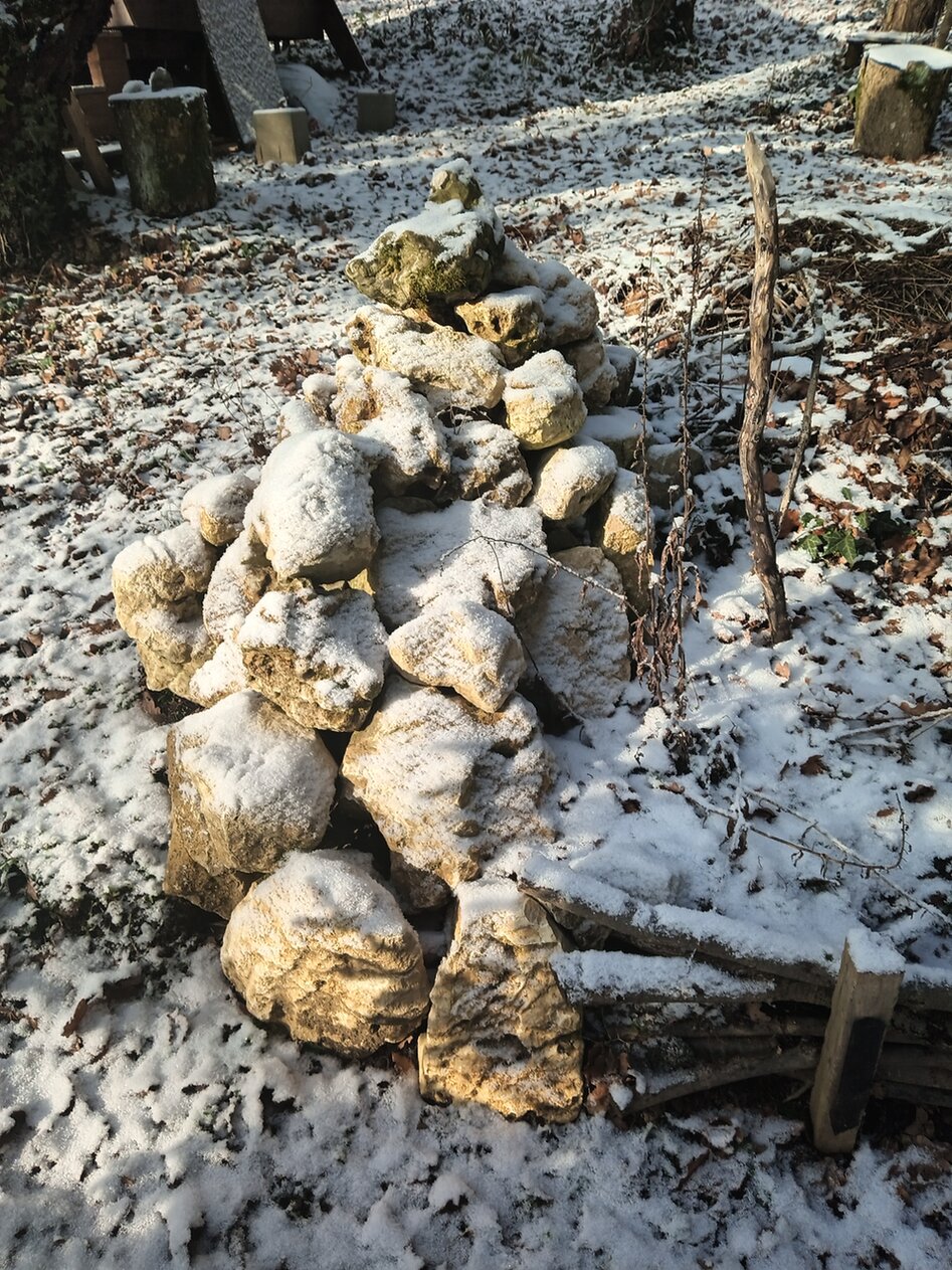 Ein Weg durch das Hanggrundstück schlängelt sich mit verschiedenen verschiedenen Hotspot Orten. Es wurden zwei Teiche angelegt in die das Regenwasser fließt und gesammelt wird und in denen Lybellenlarven sich entwickeln. Drei Steinpyramiten locken Zauneidechsen und Schlangen an, einige Sandflächen bieten Brutmöglichkeiten für Insekten. Von Jahr zu Jahr kommen weitere wilde Kräuter und Blumen in den Garten und siedeln sich dort an. Alte Bäume werden liegen gelassen und einige Gehölze für Insekten behalten.