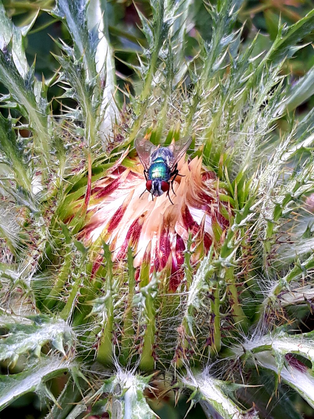 Die Farbkombination von Silberdiestel und Fliege ist ja ein Hingucker.