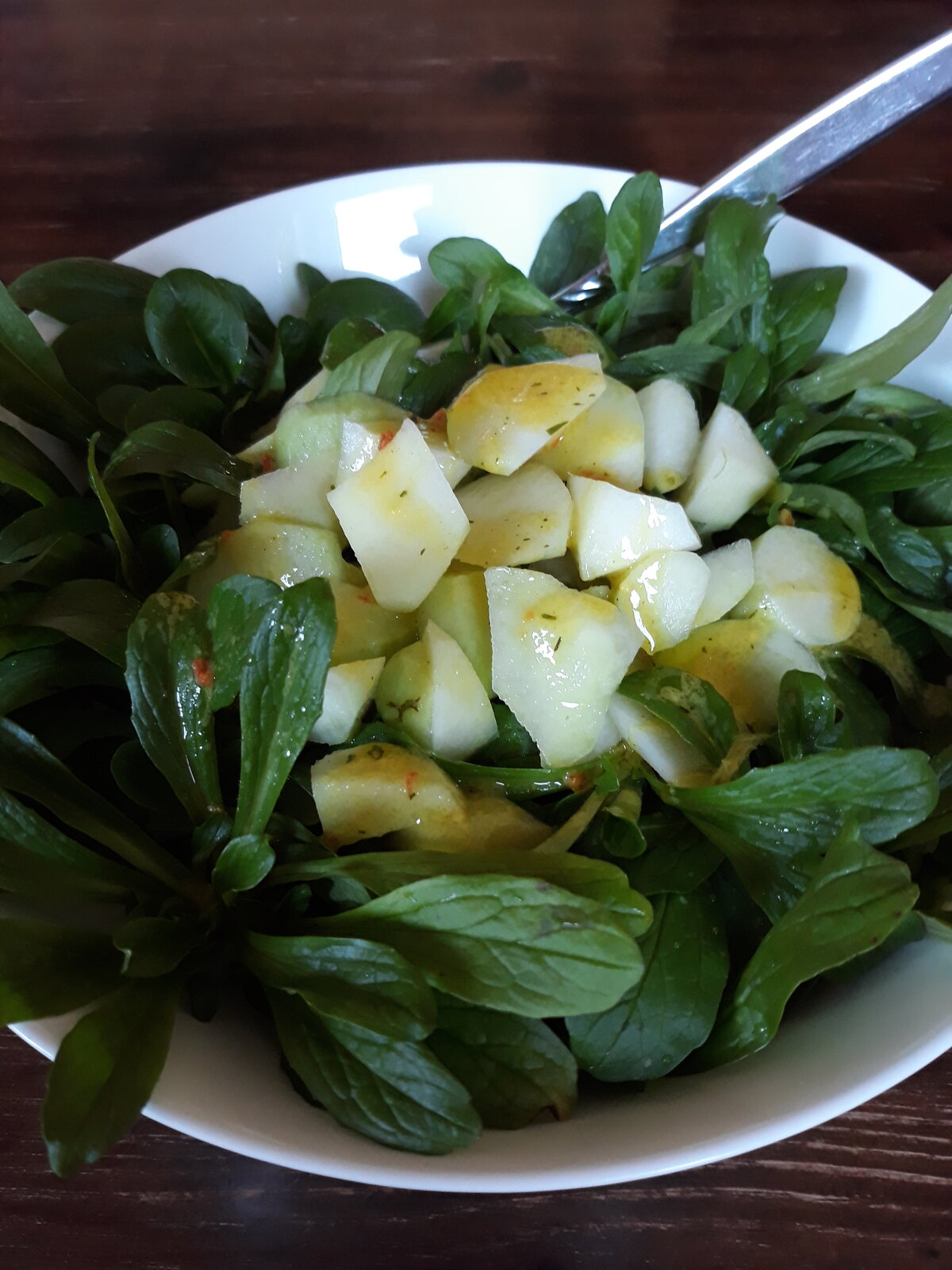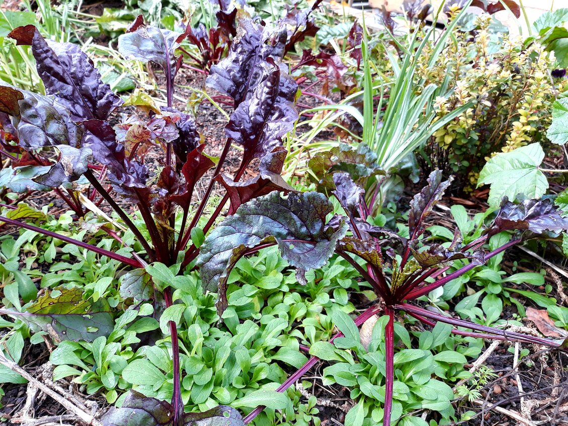 Feldsalat geht gerade in jeder Ritze auf. In den Gemüsebeeten muss ich nur den Mulch zur Seite schieben, damit er keimen kann. Kohlrabi finde ich immer wieder mal unter dem Begleitgrün/Lebendmulch.