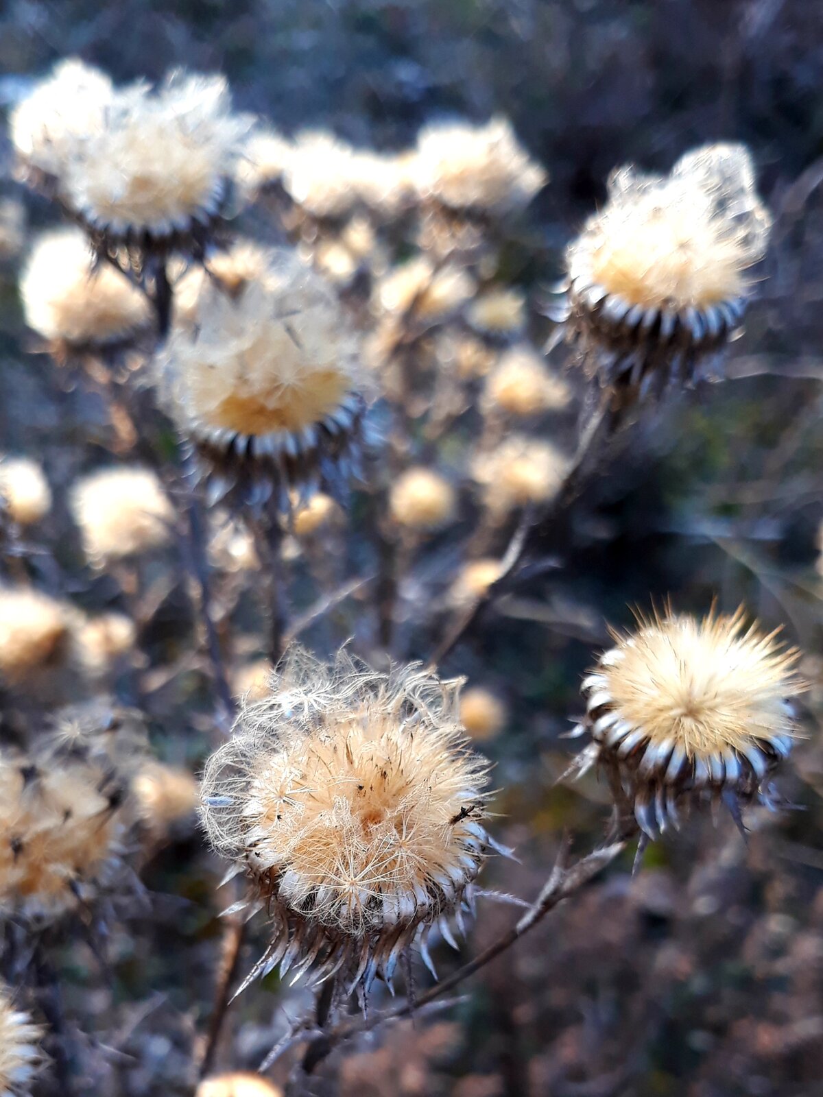 Die standhaftesten "Wintersteher" sind die Golddisteln. Sie machen einfach immer eine gute Figur. Jetzt lösen sich gerade "Schirmchen" heraus und sie wirken etwas wuschelig.