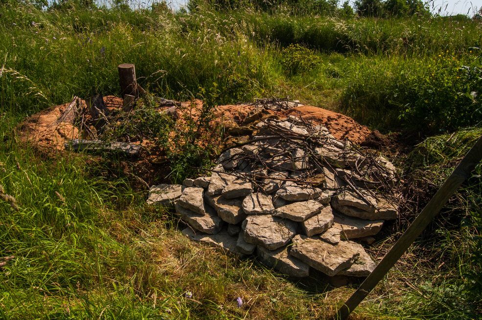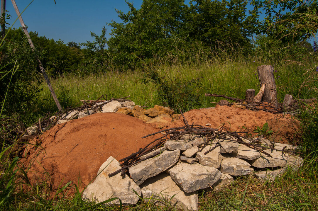 Auf der Obstwiese konnte ich am bestehenden kleinen Steinhaufen mit angeschlossenem Sandarium noch ein paar Zusätzliche brauchen, dort gibts nämlich schon jede Menge Eidechsen. Dazu kam nun noch ein weiterer kleiner Haufen. (Trittsteine auf kleinstem Raum sozusagen.