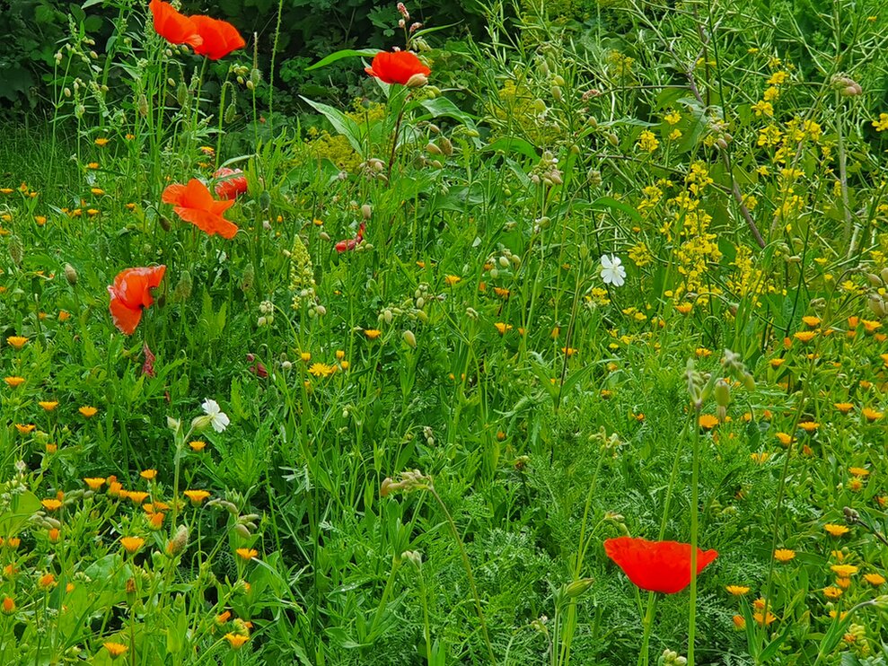 • Hot-Spot-Zone: 2021 gesäte Blühwiese (1 x im Jahr gesenst); statt Rasenschnitt selten gesenste Wiese im übrigen Garten; Magerbeete mit Steinpyramiden und Schotter, Sandarium, Dachziegelstapel für Wildbienen, Holz für Insekten (Totholz und gebohrtes)