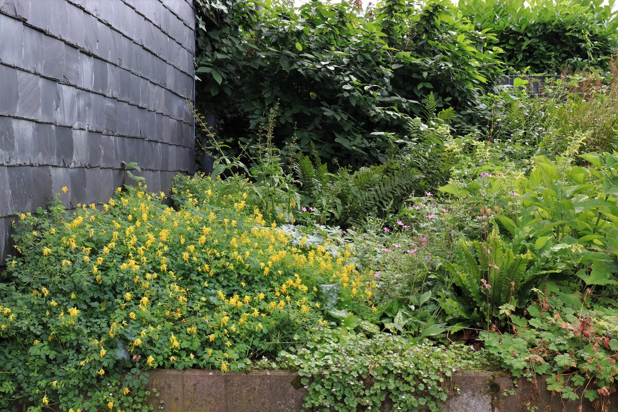 Ein super, unermüdlicher Dauerblüher für den trockenen Schatten ist noch der Gelbe Lerchensporn.